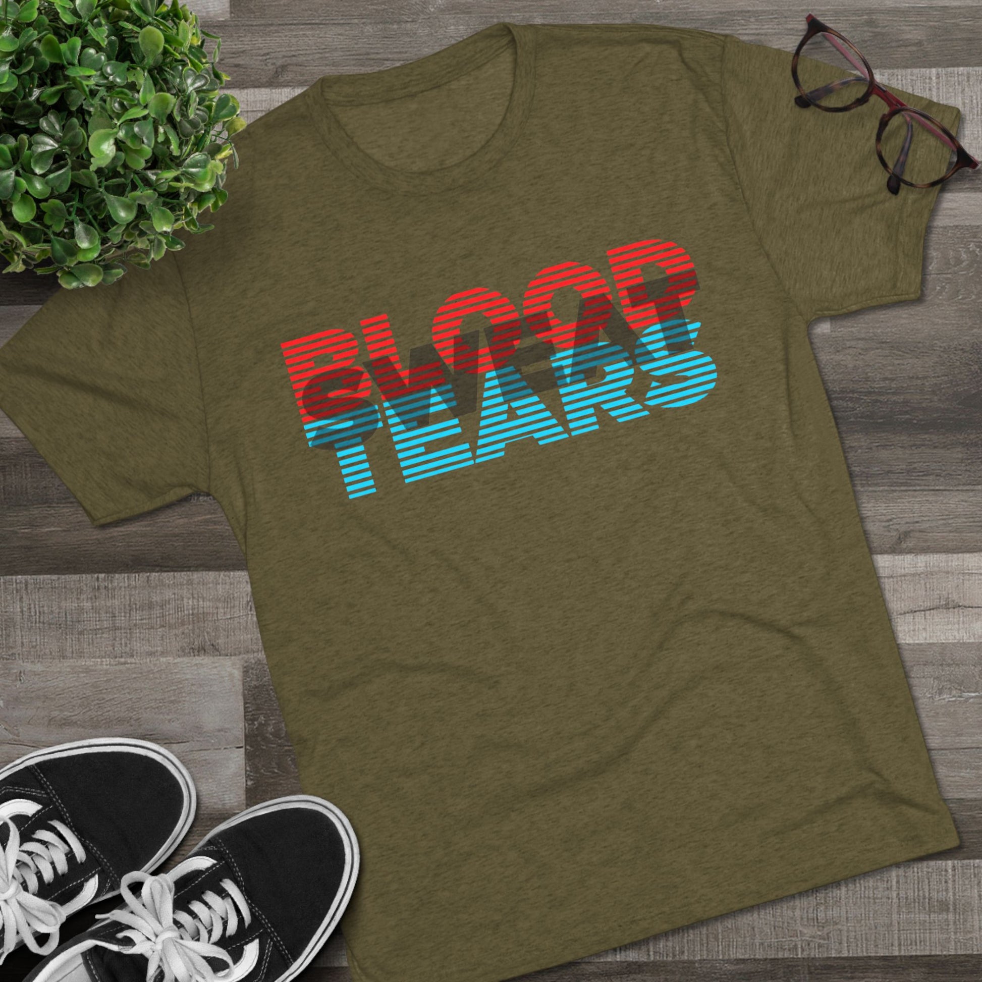 Blood Sweat & Tears Graphic Tee — Retro Red & Blue Striped Band Shirt
