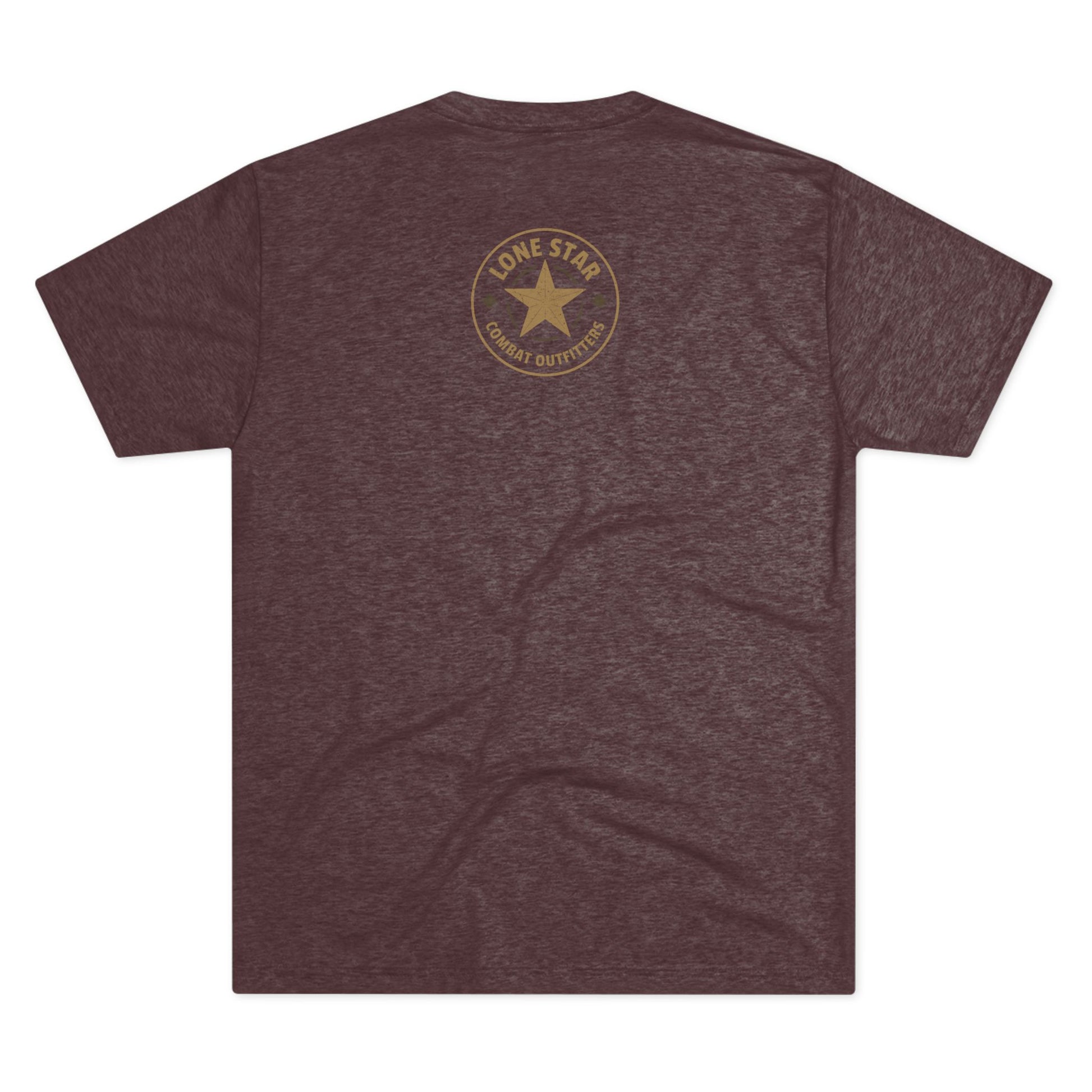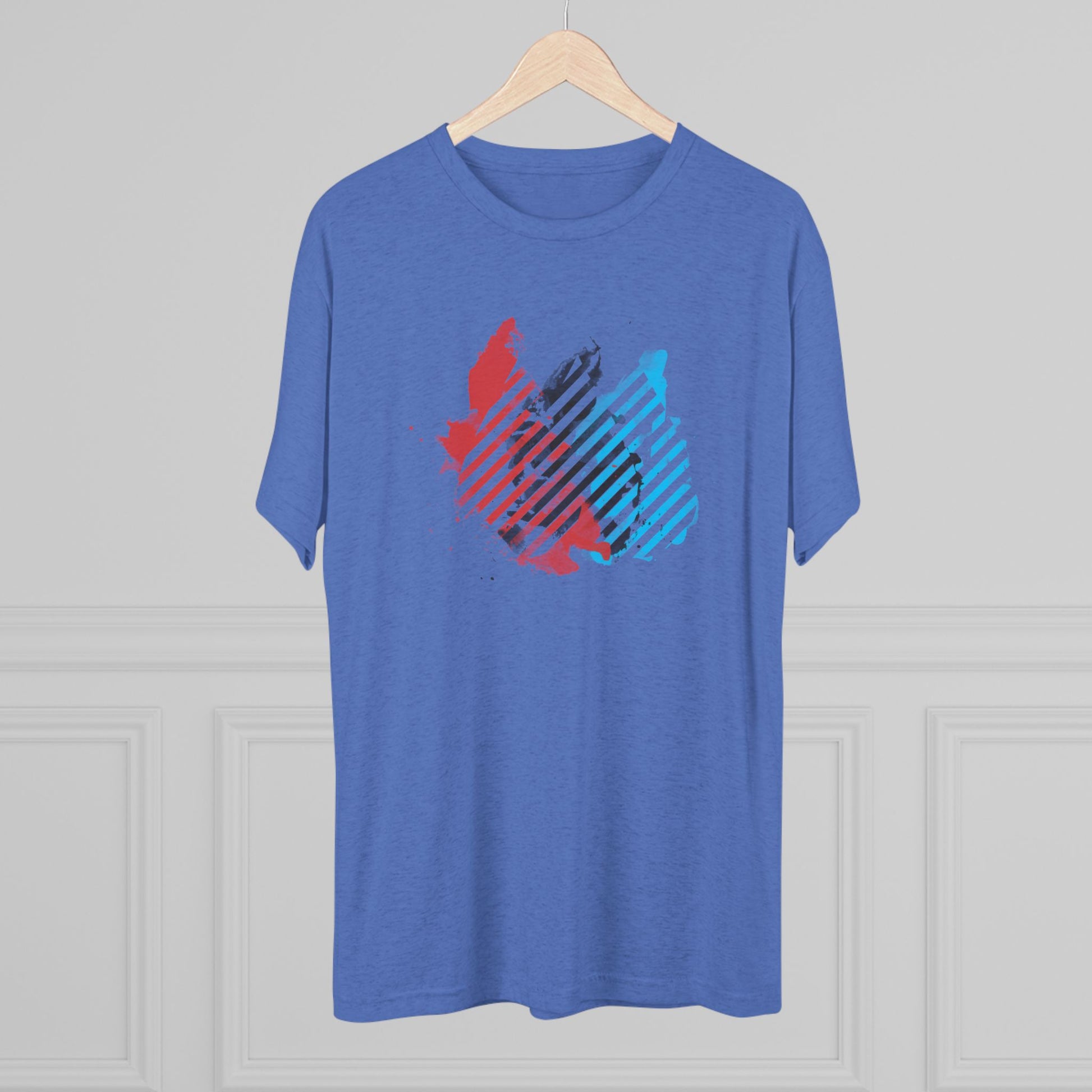 A soft, lived-in crew tee that carries quiet attitude. Lightweight tri-blend fabric drapes easily and feels like an old favorite from the first wear. Front artwork pairs three brush-stroked leaf shapes—one in distressed red, one in distressed blue one in distressed black—laid over diagonal stripes for a slightly vintage, graphic edge. A small circular skull emblem sits high on the back, giving a subtle nod to rebel bikers and road-trip nights without shouting. Wear it for low-key hangs, dusk rides, or when you want a little grit under an otherwise simple outfit. The shirt breathes in warm weather and layers cleanly under jackets when it cools down.