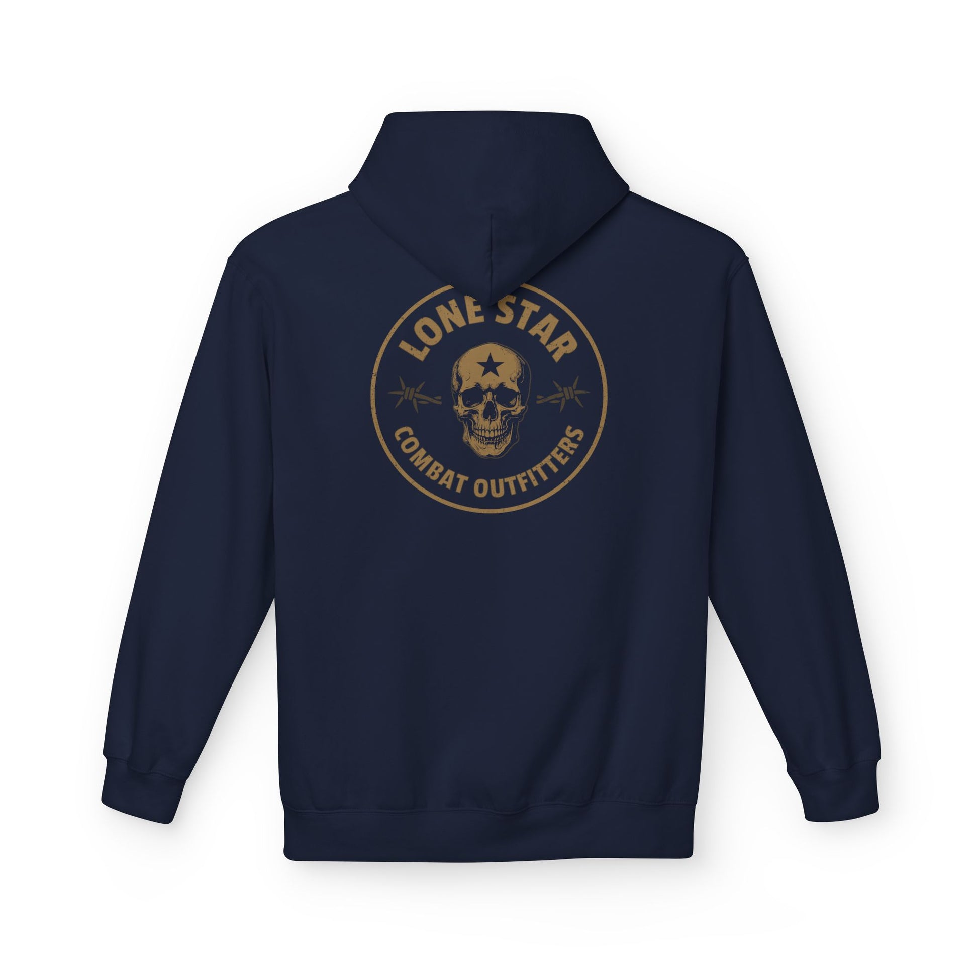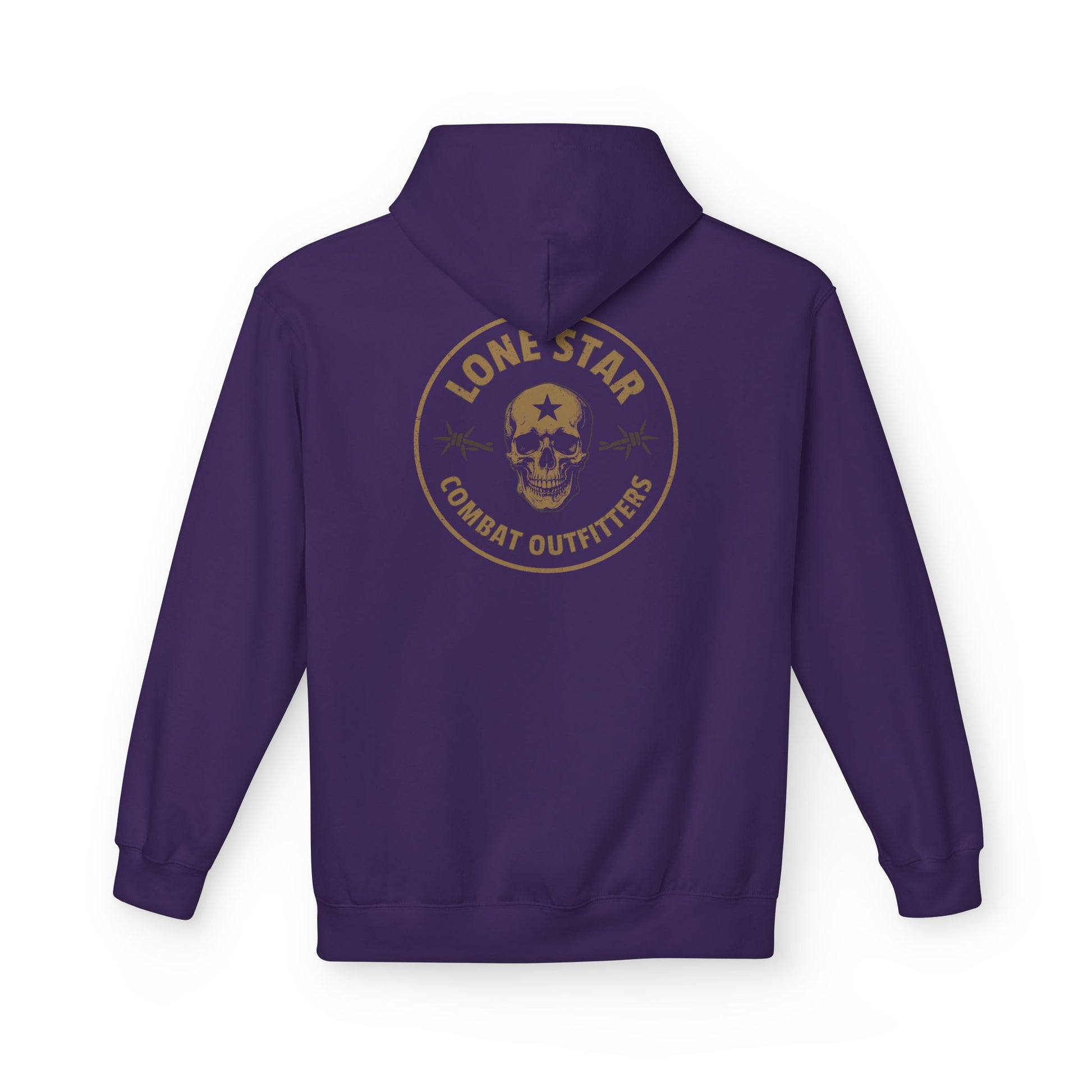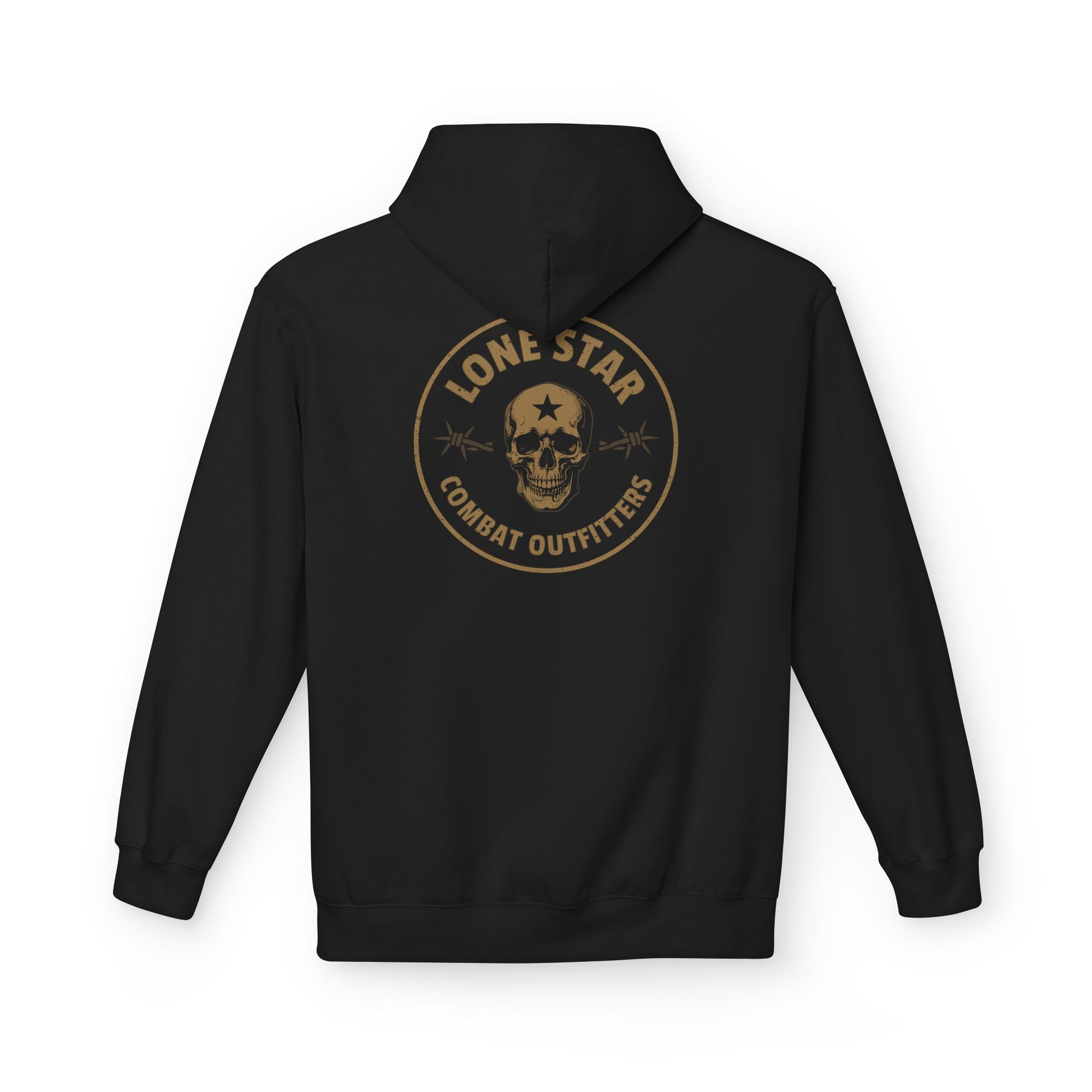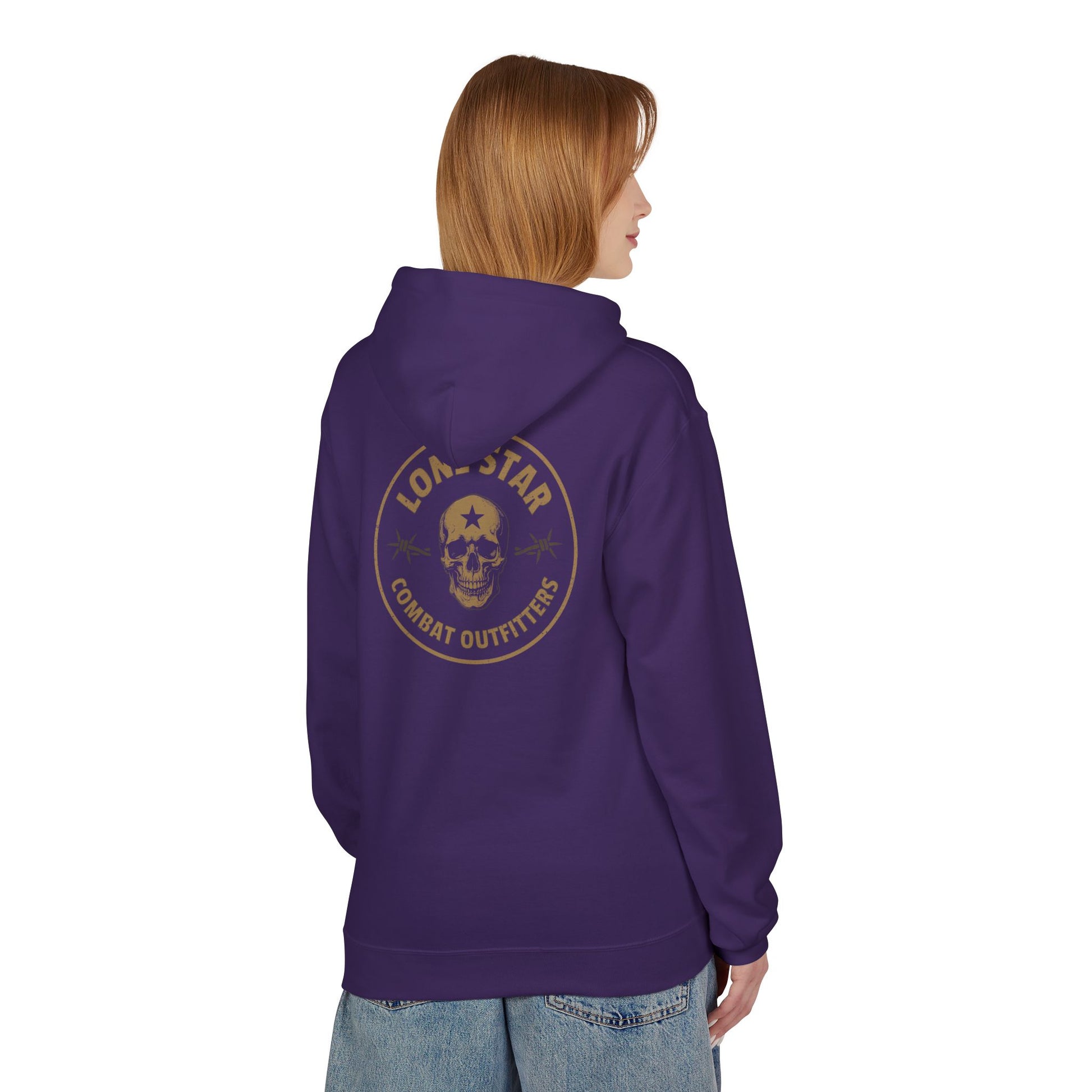 This midweight hoodie carries a rugged, lived-in energy — like a trusted jacket that's already been on a few road trips. The faded circular emblem with a skull and 'Lone Star Combat Outfitters' reads like a veteran patch: weathered, confident, quietly defiant. Wear it over a tee after dusk on the trail, throw it on for a chilly practice session at the range, or pull the hood up for a late-night drive. The relaxed drop-shoulder cut and roomy pouch pocket make it easy to layer and move in, while the soft cotton-blend fleece keeps things warm without bulk. Ethically made and OEKO-TEX certified, it’s for people who care how things are made as much as how they wear them.