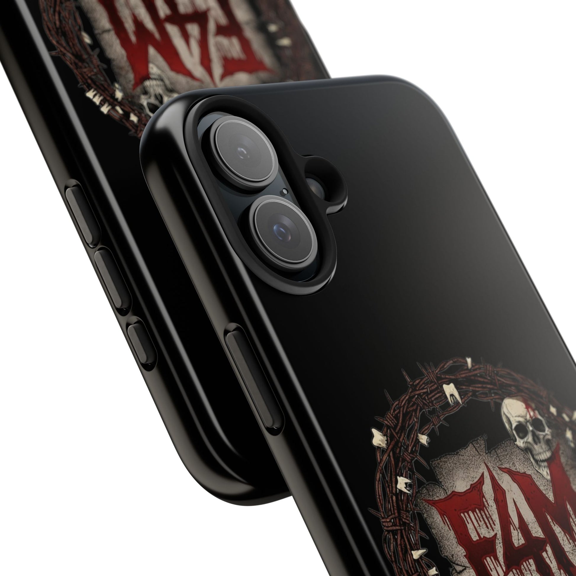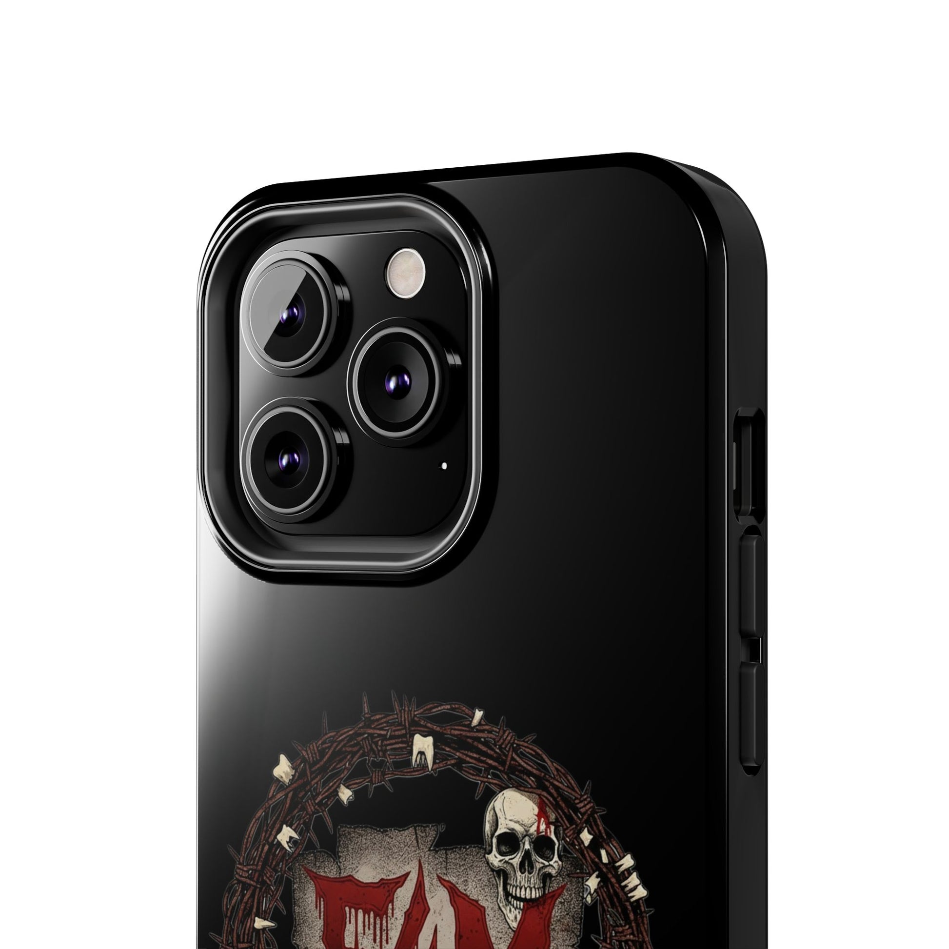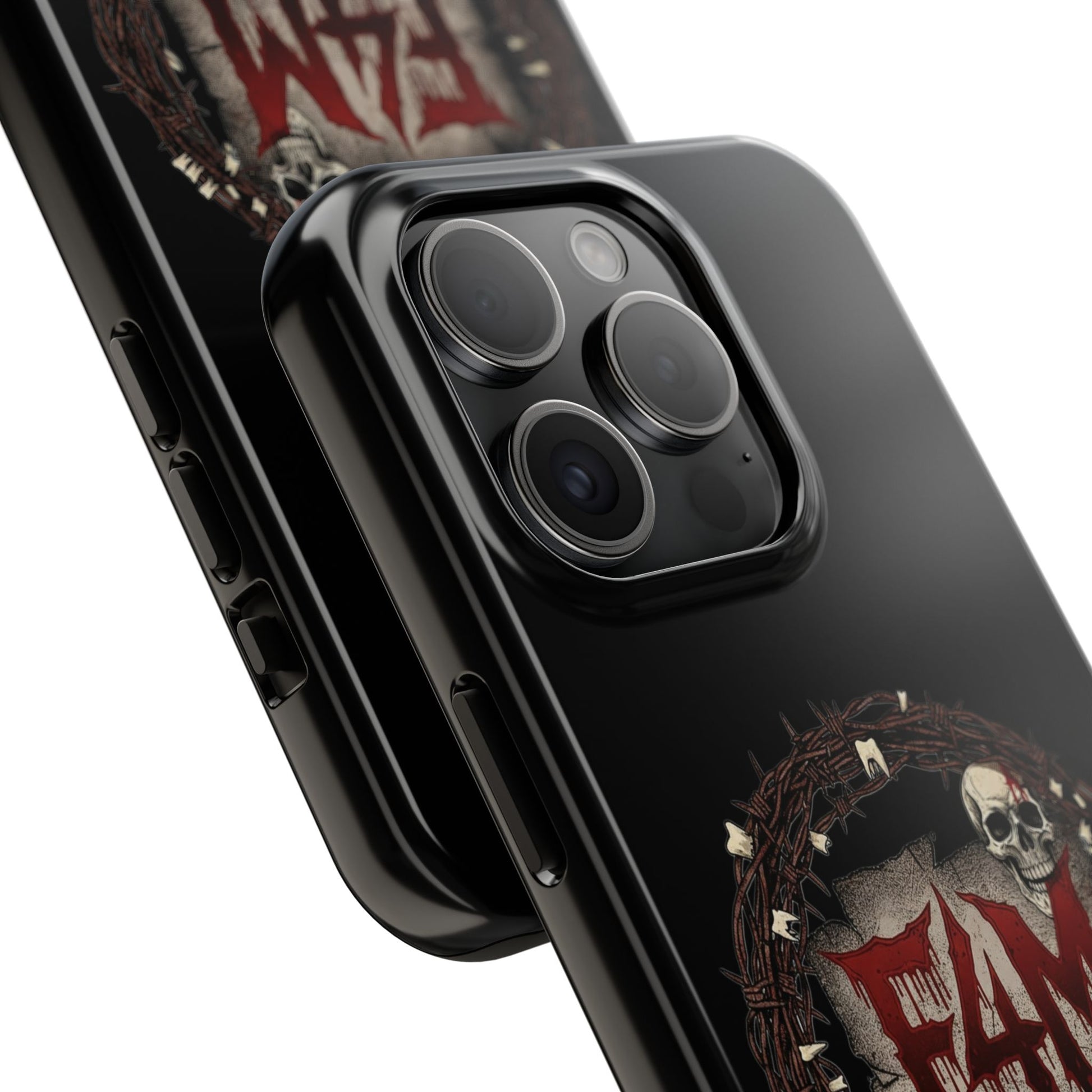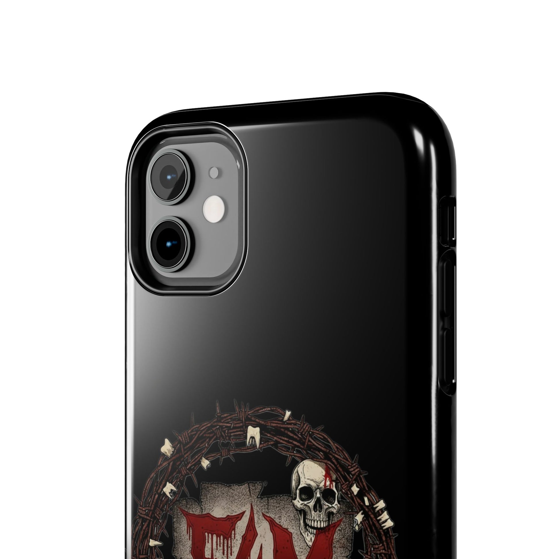 A tough, glossy phone case with a dark, gritty vibe—built to take hits and keep your device looking sharp. The design centers on a barbed-wreath emblem stained with blood-red lettering and a weathered skull accent, creating a raw, hardcore aesthetic that feels equal parts underground metal art and outlaw charm. The black, high-gloss surface makes the artwork pop while the two-piece construction and flexible inner liner cushion against drops and daily abrasion. Slip it on when you want your phone to reflect a rebellious edge during late-night gigs, haunted house runs, or long road trips where looks and protection both matter.