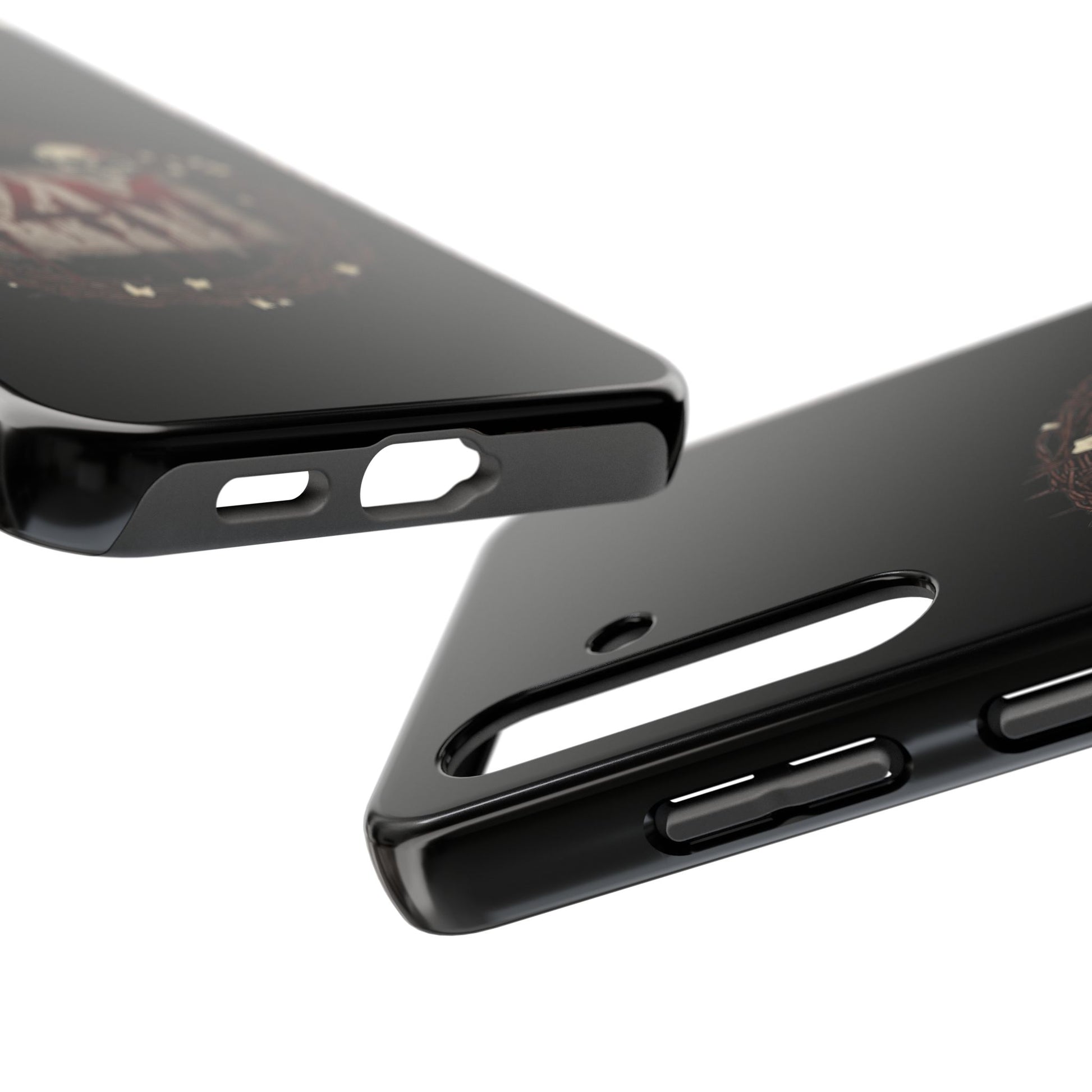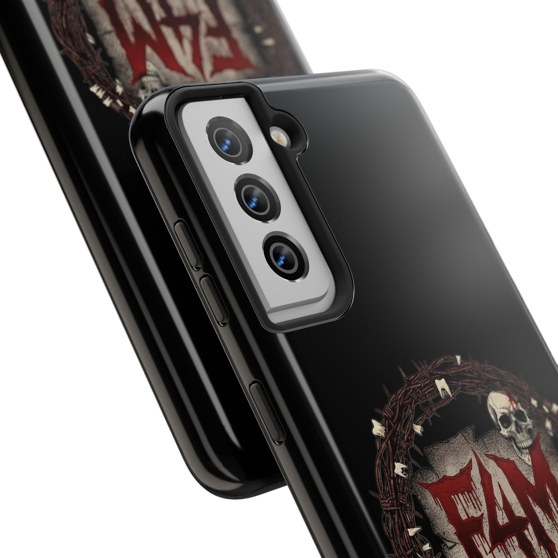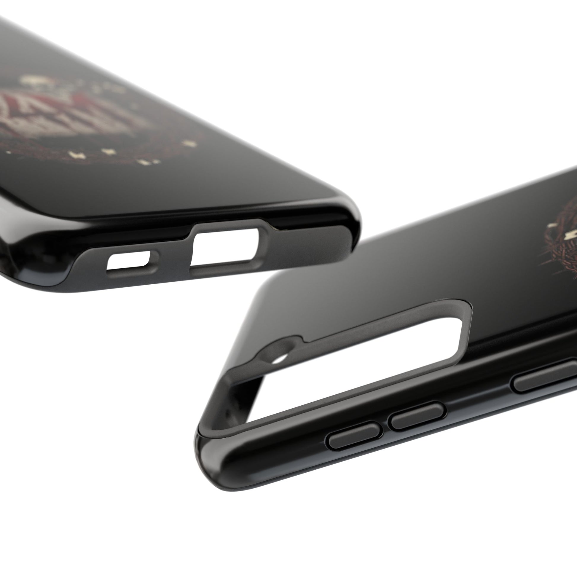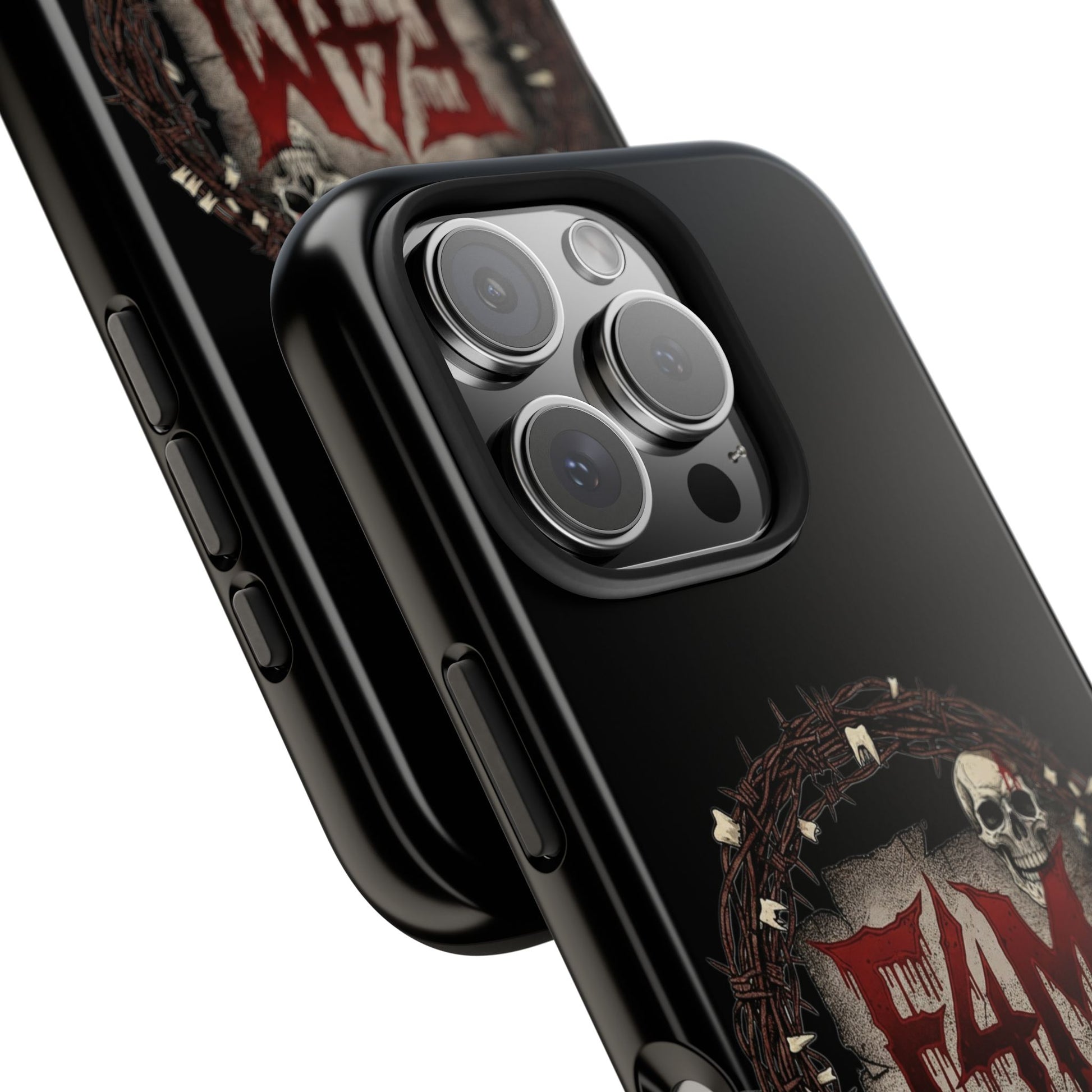 A tough, glossy phone case with a dark, gritty vibe—built to take hits and keep your device looking sharp. The design centers on a barbed-wreath emblem stained with blood-red lettering and a weathered skull accent, creating a raw, hardcore aesthetic that feels equal parts underground metal art and outlaw charm. The black, high-gloss surface makes the artwork pop while the two-piece construction and flexible inner liner cushion against drops and daily abrasion. Slip it on when you want your phone to reflect a rebellious edge during late-night gigs, haunted house runs, or long road trips where looks and protection both matter.
